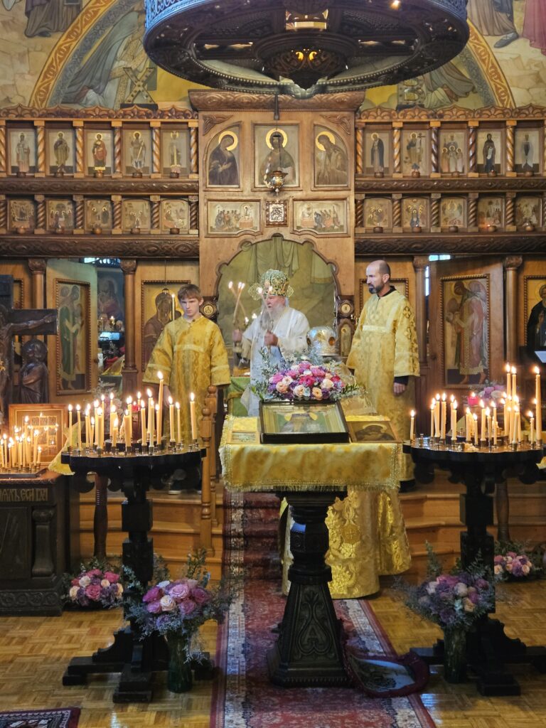 It has become a well-loved tradition at St. Sergius Parish to celebrate the feast of St. John of Shanghai and San Francisco (July 2) with a Hierarchical service, followed by a celebratory banquet for parish members and guests. This year, for scheduling reasons, the feast took place on Sunday, July 6. Bishop Andronik made a pastoral visit and served the All-Night Vigil, as well as the Divine Liturgy the following morning, joined by Rector Fr. Gregory Kotlaroff and Parish Deacon Fr. Gregory Axelrod. At the conclusion of the Divine Liturgy, the clergy celebrated a Slava service with the blessing of the Kоlach and Kolivo, as many Orthodox Serbs particularly revere St. John and attend this festal service, remembering the saint’s early monastic days in Serbia.